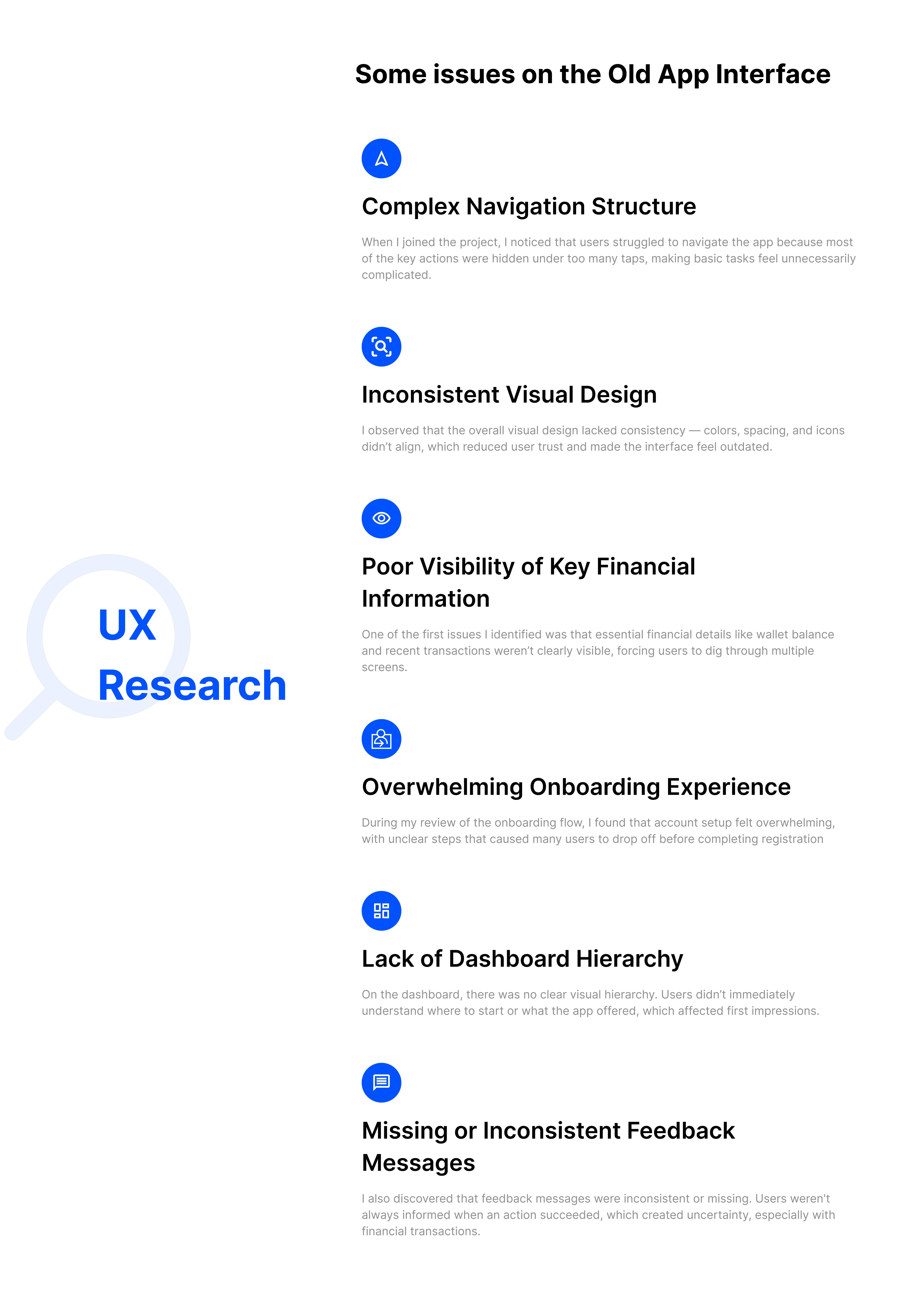 The previous version of the DNIPay app had significant usability challenges that affected user satisfaction and efficiency. Navigation was complex, key financial information was difficult to access, and the overall visual design lacked consistency. Essential features like onboarding, payments, and transfers involved too many steps, causing frustration and slowing down user tasks. The app lacked clear feedback messages, leaving users unsure whether actions—especially financial ones—were completed successfully.